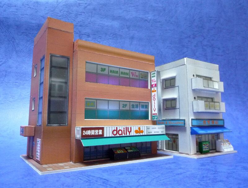 ○自作のNゲージ用(1/150)ストラクチャーになります。駅前にあるようなスーパーと書店をイメージして作りましたお客様自身で制作するキット商品です。